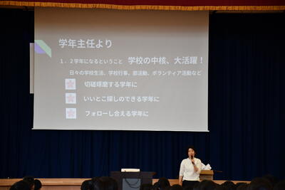 次に、学年主任が「切磋琢磨する学年に」「お互いのいいとこ探しが出来る学年に」「フォローし合える学年に」と話がありました。