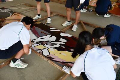 体育大会の応援練習も2日目を迎えました。運動場で応援団演舞と人文字の練習が行われている中、3階の被服室と物理室では、紅団と白団のパネル作りがそれぞれ急ピッチで進んでいます。
