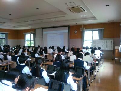 株式会社リクルートの澤井様がご自身の学生の頃の体験談や進路選択に必要なスケジュール把握、情報収集についてお話しくださいました。また、夏のオープンキャンパス参加に向けて、興味関心のある学校の調べ方等についても説明してくださいました。生徒たちはChromebookを使って、気になっている学校の情報を調べようと熱心に取り組んでいました。大学のオープンキャンパス中には、早めの事前予約が必要な学校もありますので、是非計画的に参加して欲しいと思います。