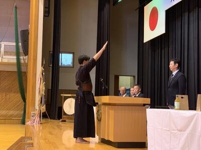 令和6年10月20日(日)済々黌高校体育館にて第31回佐々旗親善剣道錬成大会が行われ、本校の剣道部員5名が参加しました。開会式では、昨年度優勝チームとして、天草高校主将の山内さんが選手宣誓を務めました。