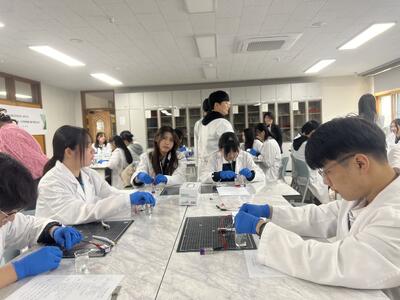 本校生徒、土坪高校生徒ともに韓服に着替えての見学。