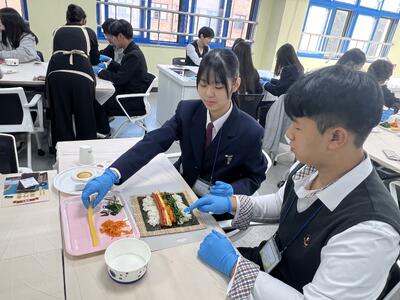 今日の1限目は、土坪高校の保護者の皆さんにお世話になり、韓国の郷土料理の巻き寿司作りに挑戦しました。