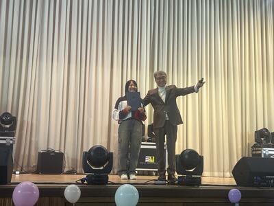 本校から代表として一年生の小崎さんと田口さんが韓国語で見事に挨拶をし、大喝采を受けてしました。