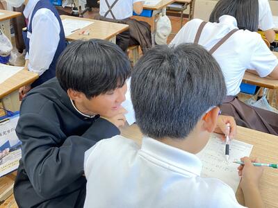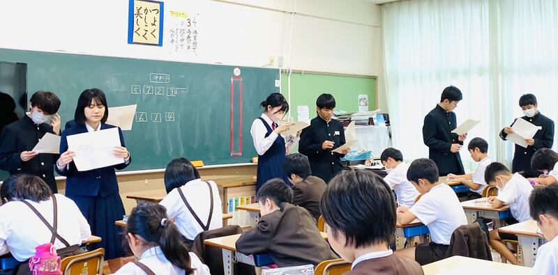 年に2回設定されている公開授業週間ですが、この1週間は地域の学校の先生方や保護者の皆様が授業見学に来られるだけではなく、各教科で研究授業を行ったりお互いの授業を見学したりして、職員が学び合う期間でもあります。本日3時間目には、1年6組のコミュニケーションⅠで英語科の研究授業を実施しました。本時扱ったのは戦時下に置かれた少女が世界に向けて送ったメッセージを題材とした内容です。生徒たちは少女の心情に着目し、英語を活用して内容読解の活動を積極的に行っていました。