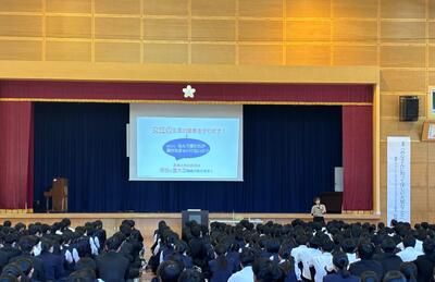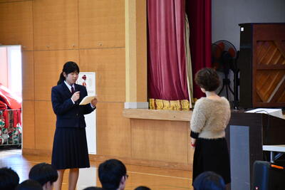 最後に、2年生の酒井さんが生徒を代表して、「改めて薬物依存のリスクや社会的影響を理解できました。自分の人生も周りの人の人生も壊してしまわないように、断る勇気を持ちたいです。」と謝辞を述べ、薬物乱用防止教室は終了となりました。