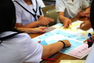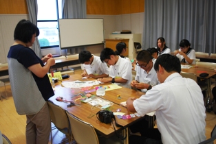 午前の部では、しおりとお守り作成を行ないました。天草地区の図書委員が一人ひとり自分が好きなようにデコレーションしたしおりや、中に花の種を入れたお守りをつくりました。どこの高校も真剣に取り組んでおり、たくさん作ったしおりやお守りなどは、夏休みに体験入学に来る中学生にもプレゼントします。皆さんに本のよさを知ってもらいたいと思います。