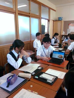 熊本第二高校のスーパーティーチャーである友田先生を始め、多くの先生方の参観のもと授業が始まり、大嶽先生も生徒たちも少し緊張していました。