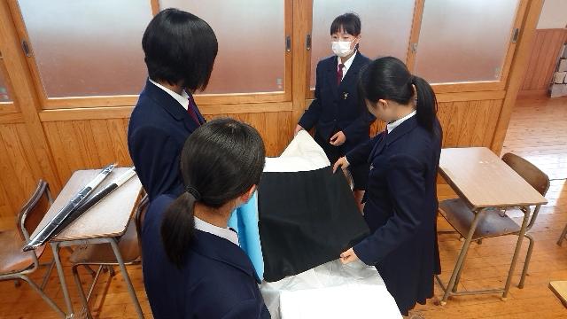1年家庭科では初めてミシンを使い、巾着袋を製作しています。