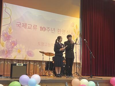 昨年10月に韓国を訪れ、姉妹校である土坪(トピョン)高校で親善交流を行ったことについて、訪問団14名を代表して発表を行いました。