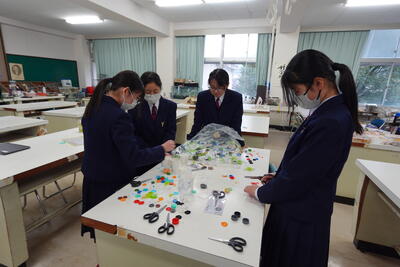 本日は「AMAKUSA DAY」に向けて、科学部有志がペットボトルキャップで何かを作成していました。