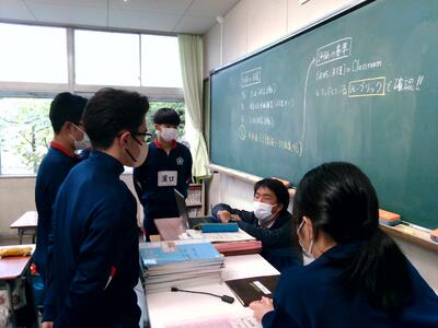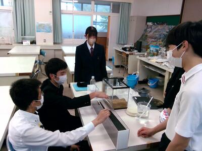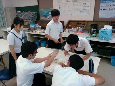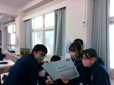 7限目にはASⅢのメンバーも加わり、地学室もますます活気づいてきました。ASⅢで行っている「魚糞」の継続研究を考えている班が先輩に助言をもらったり、「電磁誘導班」が物理室で活動している「波力発電班」の先輩に報告書を見てもらったりしています。みんなラストスパートがんばってください!