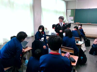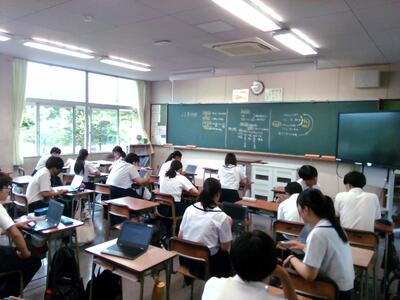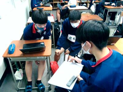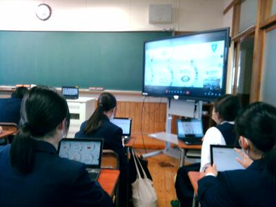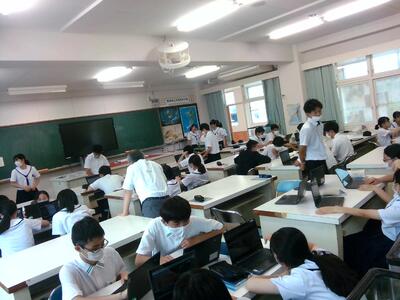 また、7限目には、情報社会の次に来ると言われているSociety5.0について、情報科の藤岡先生による講義がありました。ICTを活用した全教室一斉講義が行われ、動画やスライドを確認しながら学んでいきました。