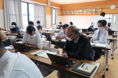 今回の研修では、生物の授業での探究場面の例を学んだ後、各教科で実際の教科書を持ち寄り、自分の教科でどのような探究場面が設定できるかを個人で考えた後、教科のメンバーで共有したり、意見交換したりしました。