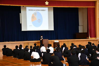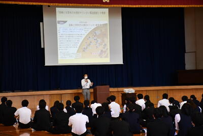 まず、生徒にとって身近な吉本興業や日本郵政などの企業がどのようにSDGsに関する取り組みをしているかについて紹介がありました。また、東北大学や信州大学での近年の動きや、天草での「地域創生」の様々な活動についても紹介されました。人口減少により「消滅する可能性の高い」とまで言われている天草を「持続可能」なものにするために、私達ができることは何なのでしょうか。