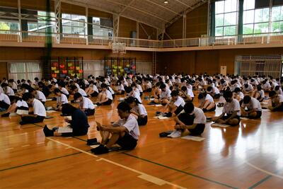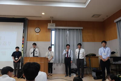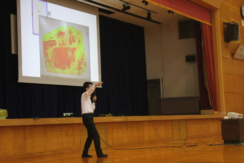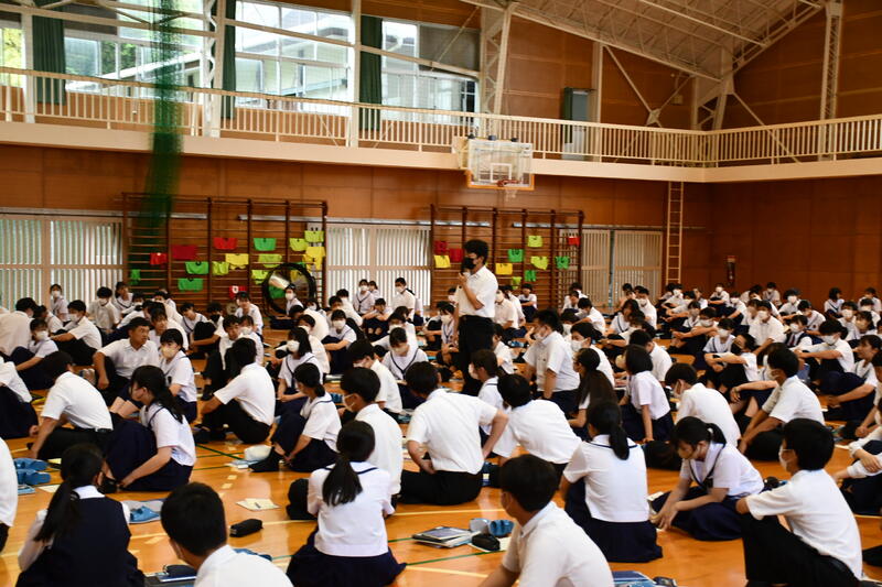 After listening to the Professor’s talk, students discussed in groups. Prof. Kanaoka explained that this “lecture followed by discussion” style of learning has recently been used a lot at universities. Students shared their ideas and discussed for about twenty minutes in groups, with staff from Kumamoto University and Amakusa City giving students some advice during that time.