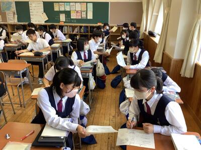 黙々と個人で取り組むクラス、担任の先生が生徒と対話してアイデアを引き出すクラス、友人と去年の研究などについて意見交換するクラスなど、クラスによって取り組み方は色々ですが、それぞれが天草の課題解決のための1歩を踏み出しました。中には、昨年取り組んだ研究を継続しようと考えている生徒もいるようです。自分の興味・関心のある分野で、天草に貢献できる研究ができるといいですね。みんなの想像力や実行力に期待しています!