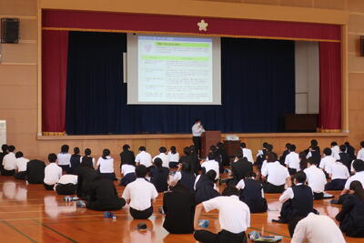 7限目は「天草と災害について〜天草の成り立ちと自然災害〜」をテーマに、熊本大学大学院最先端科学研究部地球環境科学分野教授の松田 博貴様に講義をいただきました。「天草の自然を知りどんな災害が起こり得るのかを知ることが大切」という言葉を聞き、生徒たちも自分ごととしてお話を聞いていました。