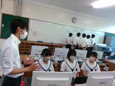 講義を受けた後、生徒たちはグループでディスカッションを行いました。この、講義の後にグループワークを行うという学習方法は、大学でもよく行われているということです。約20分間ほど、グループ毎に意見を出し合い、講義を受けて気づいたことや疑問に思ったことを整理しました。各クラスに熊本大学や天草市役所の方々がアドバイザーとして入っていただき、討議の補助や助言をしてくださいました。