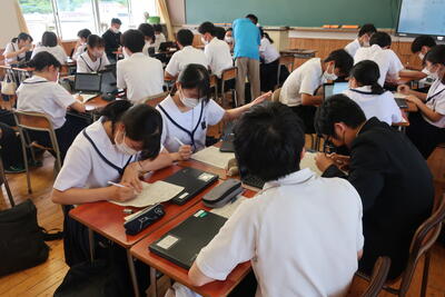 黙々と個人で取り組むクラス、担任の先生が生徒と対話してアイデアを引き出すクラス、友人と去年の研究などについて意見交換するクラスなど、クラスによって取り組み方は色々ですが、それぞれが天草の課題解決のための1歩を踏み出しました。中には、昨年取り組んだ研究を継続しようと考えている生徒もいるようです。自分の興味・関心のある分野で、天草に貢献できる研究ができるといいですね。みんなの想像力や実行力に期待しています!