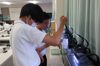 科学部の2,3年生が新入部員に対して、研究活動の指導をしています。