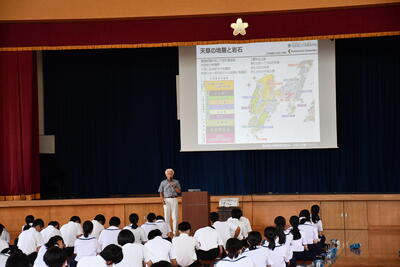 7限目は「天草と災害について〜天草の成り立ちと自然災害〜」をテーマに、熊本大学大学院最先端科学研究部地球環境科学分野教授の松田 博貴様に講義をいただきました。「天草の自然を知りどんな災害が起こり得るのかを知ることが大切」という言葉を聞き、生徒たちも自分ごととしてお話を聞いていました。