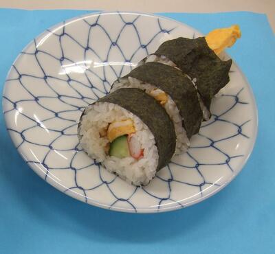 吸い物の飾り切りでは、「結びかまぼこ」や「結び三つ葉」、「絹ごし豆腐の菊花切り」に挑戦しました。生徒たちの中には、巻き寿司や飾り切りに初めて挑戦した生徒もおり、日本料理の調理法に緊張したり苦戦したりしながらも、楽しそうに実習に取り組んでいました。出来上がった料理もとても美味しそうでした。