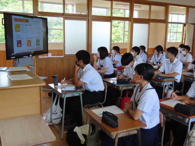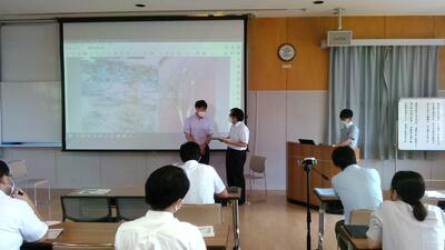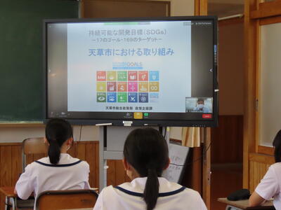 講演のなかでは、天草市として他の組織との連携を積極的に図っていること、その一環として本校とも連携していること、天草市が令和4年度の重点課題として設定していること等について説明がなされました。生徒たちにとっては前回のATⅠの時間に学んだ天草市のSDGs推進計画についてより詳しくその取り組みについて理解を深める貴重な機会となりました。