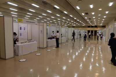 ポスター発表会場(パーティションとチェーンで人との間隔を1m以上にしています。)