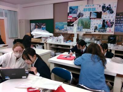 After school, we could hear some English conversation coming from the Earth Science room on the second floor of the Science building. What is it?” Peeking in, we found some SSH Taiwan Study Tour participants. They are practicing presentations with Zoe and Jennifer, who are both assistant language teachers (we call them "ALTs”).