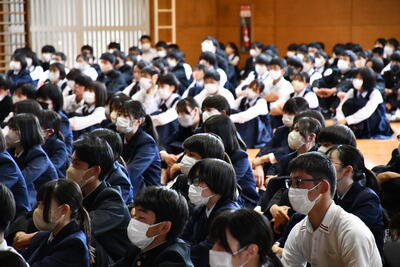学年集会の第1回目は、中川校長先生のお話でした。穴埋めのプリントを使って、天草高校の歴史や三綱領などについてクイズ形式でお話いただきました。生徒たちはしっかりと考え、積極的に発言していました。入学式から続く緊張が少しはとれたようでした。
