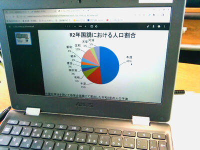 今日の授業では、データサイエンスについて学習しました。天草市の人口割合や人口推移のデータから読み取れることや天草に貢献できることを考えます。データを検索し、スプレッドシートに変換して加工できるようにします。データを加工しグラフや表に作り変え、天草に貢献できることをそれぞれが考えました。