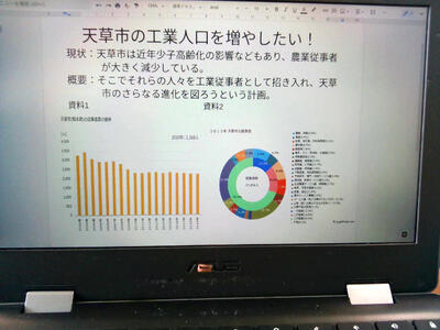 それぞれ興味を持ったデータについて調べ天草市への提案を発表していました。