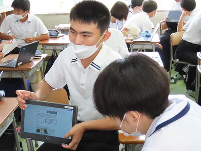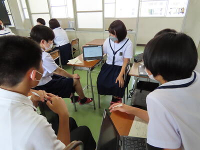 生徒たちは前回選んだゴールに関連する政策について、市のホームページから天草市がどのような取り組みを行っているかについて学びました。普段見慣れないような資料もあり、思うように進まない生徒もいましたが、周りの生徒と協力しながら活動を進めていました。
