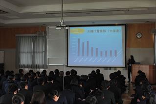 4月25日(火)7時限目に体育館で天草学連続講義がありました。これは、SSH指定により可能となった学校設定科目『天草サイエンスⅠ』の一単元です。生徒たちは天草学連続講義をとおして、地域課題を探求することで一年間の研究テーマを模索します。
