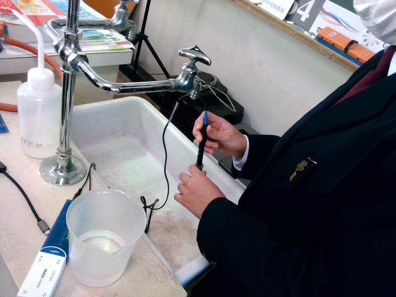 天草高校の周囲を流れる町山口川の汽水域を調査している班が、自分たちの研究で汽水域と考えられる場所の土を採取して、土壌分析を行っていました。