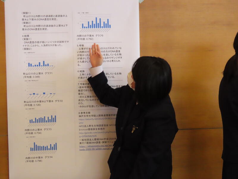 科学部の発表では、Global Link Onlineで世界1位を獲得したアマモ班による「海面上昇量予測とアマモの定植を組み合わせることで未来を守る~より身近な地球温暖化対策に向けて~」と題して、これまでの研究成果の総まとめとしての発表になりました。