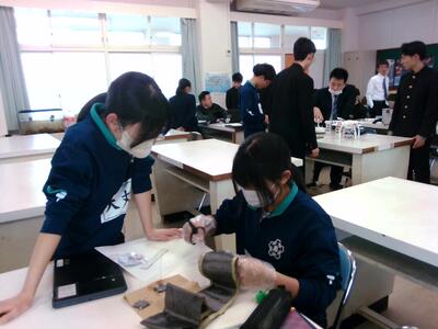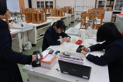 さて、ATⅠでは教室、理科棟、 家庭科室など校内の色々な教室で活動を行っているのですが、 今日は、地学室におじゃましてみました。というのも、ここは、 毎週この時間にはASⅠ(1年生)とATⅠ(2年生) が同じ部屋で研究を進めているという、 とてもユニークな環境だからです。ここでは、1年生3班、 2年生3班が貝の粘着成分や自転車のスリップ軽減対策など、 それぞれ独自性のある研究に取り組んでいます。例えば、2 年生のある班は、身近な草花からの消毒液の作成について研究しており、現在は2種類の作成方法に取り組んでいるそうです。この班では1つ目の方法で作った消毒液を保存していたところ、残念ながら年末年始にカビが生えてしまったとのことで、今日の活動ではその消毒液の観察を行っていました。班のメンバーは上手く出来なかったので落ち込んでいるかと思いきや、カビの繁殖の違いから消毒効果が検証できないか協議していました。まさに「ピンチをチャンスに変える」です!