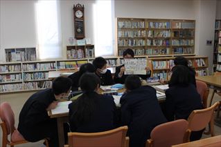 3年2組「図書館朝礼」の様子です。朝課外終了後から図書館に移動し、朝の読書も図書館で行ないました。
