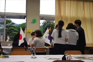 その後はUNESCO部のメンバーとの交流の時間です。2人ずつ、各テーブルを回り、韓国のおはじきやお茶を体験したり、お面作りをしたりしました。また、16時からは歓送式が行われ、両校の代表者の挨拶や、天草高校生への証書と記念品の授与などがありました。以上で土坪高校での活動は終了。仲良くなった生徒たちとの別れを惜しみながら、天草高校の12名はホームステイに向かいました。