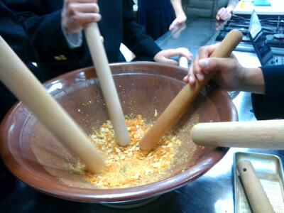 Walking down the hallway during AT class, we heard some bustling downstairs... from there also came a somewhat “citrusy” smell. We couldn’t help peeking into the cooking room, and found 30 students busy working there.