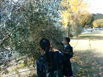 正解は... 3! 天草高校のお隣(徒歩3分です)にある本渡南小学校の運動場にオリーブが実っているという情報をいただき、収穫におじゃましました。