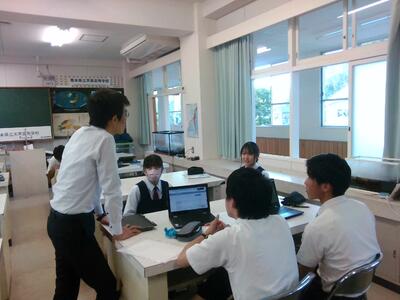 In ATⅠ, students go to many different classrooms to meet in groups. However, there is only one room in which both 2nd and 3rd graders meet in the same period - the Earth Science room. 2nd graders can envision what they will be doing in the future through seeing what their seniors are doing now: writing proposals to Amakusa city with their research results. The result? A unique atmosphere that could help younger students a lot!