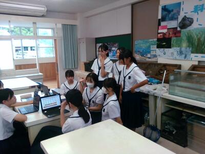 2、3年生の活動風景をカメラに収めるべく、ある教室にお邪魔したところ、ややっ! 窓の外に怪しい人影が!! ...よくよく話を聞いてみると、「外来種」の植物の研究を始めたばかりの、2年生たちでした。まずは、校内の外来種の植物を調査・記録しているとのことです。2年生の多くの班は教室内で研究計画を立てている一方、既に調査やアンケート、実験の準備などにとりかかっている班もあります。(これは11月の「中間発表会」も期待できそうですね!)