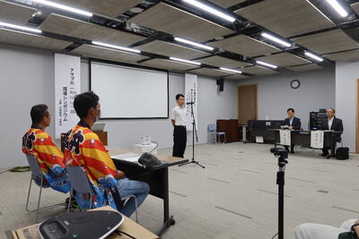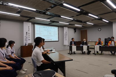 午前の部の後半には、科学部の石津さんによる「天草ブルーカーボンニュートラル」に関する発表の後、パネルディスカッションを行いました。現時点では廃校のプールを活用してのアマモ養殖を模索しているところですが、具体的な場所や海水の確保等について、天草市長の馬場様より質問や提案がありました。また、天草市環境審議会の金澤様より、養殖の際に考慮すべき海水の塩分濃度や必要な栄養素について、専門的な立場から助言をいただきました。また、科学部OBの崇城大学池田さんから淡水でのアマモ養殖の可能性について、自身の研究の状況も合わせて報告がありました。また、御所浦でアマモ場の再生に取り組んでいる杉原様より、養殖したアマモを環境の違うところに移す場合に生じる影響についてもご意見をいただきました。更に、天草市のブルーカーボンニュートラルに関する取組状況や崇城大学での研究についても説明や協議が行われ、様々な視点から今後の具体的な活動や連携について考える良い機会となりました。