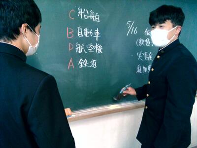 A 3年生の先輩がアマモからバイオエタノールを生成する研究をされているので、よくお話を伺ったり、相談したりしています。今日、化学の先生から研究の新規性をもう少し考えることと、初めから多くの原料を試すのではなく、1つの原料でポイントを絞って研究するという助言をいただいたので、もう少しグループで話し合ってみたいと思います。