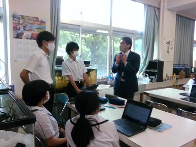 訪問では、学校長からの概要説明の後、ホタル班の2人が研究発表を行いました。