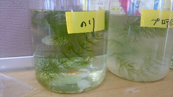 1年生の教室でメダカを飼育しているビーカーを見つけました。