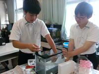 同じ教室で、「水遊び」している生徒たちも発見! この、3年生の「メタンガス班」は、2名と少人数の班で、とても仲良しで有名(?)です。今日は、水上置換法(久々に聞きました!)で、メタンガスを別容器に移し、これからガスの濃度を調べるとのこと。がんばって!