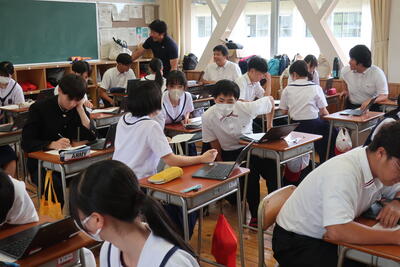 2年生と3年生が、今日から同じ空間で研究を始めました!(手前の女子が3年生、奥の男子が2年生です。)