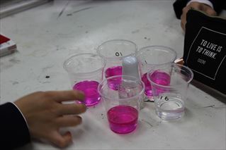 水の入った紙コップを3人の人と混合し続け、最終的に手元に残った水に試薬を垂らし、色づくかどうかを実験しました。ピンク色になった水は、誰と誰と交換した水だったか…。